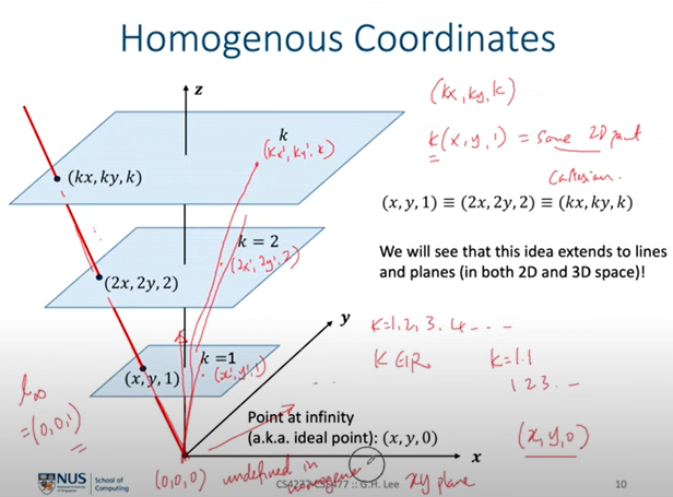 - Cartesian 의 xy평면은 Homogeneous 에서는 Point of Infinity, 즉 (kx, ky, k)에서 k=0인 경우와 같다.
